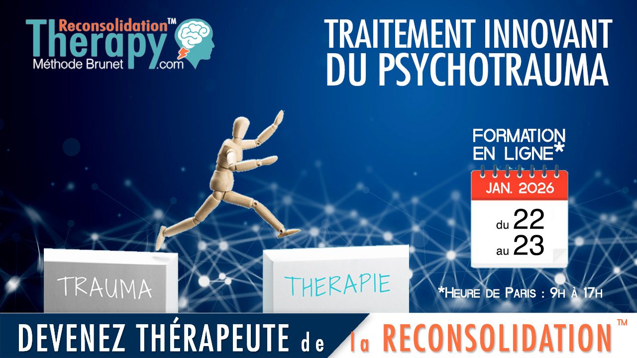 Basée sur les dernières découvertes en neurosciences, la thérapie innovante de la Reconsolidation™ a fait l’objet de nombreuses recherches scientifiques permettant aujourd’hui un recul sur son efficience. Cette méthode associe la prise d’un agent pharmacologique à une psychothérapie brève.