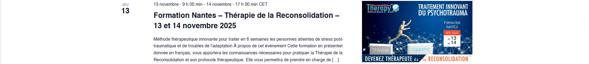Based on the latest discoveries in neuroscience, the innovative therapy of Reconsolidation ™ has been the subject of much scientific research, allowing today a hindsight in its efficiency. This method combines taking a pharmacological agent with brief psychotherapy.